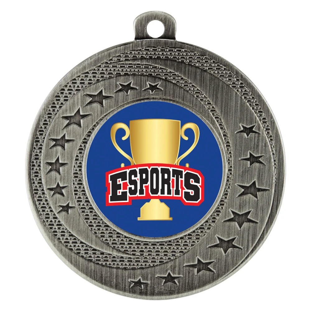 A 50 mm metal medal featuring a 25 mm insert framed by layered star and textured detailing for esports trophies. The circular form includes defined edging and a rear surface suitable for engraving.