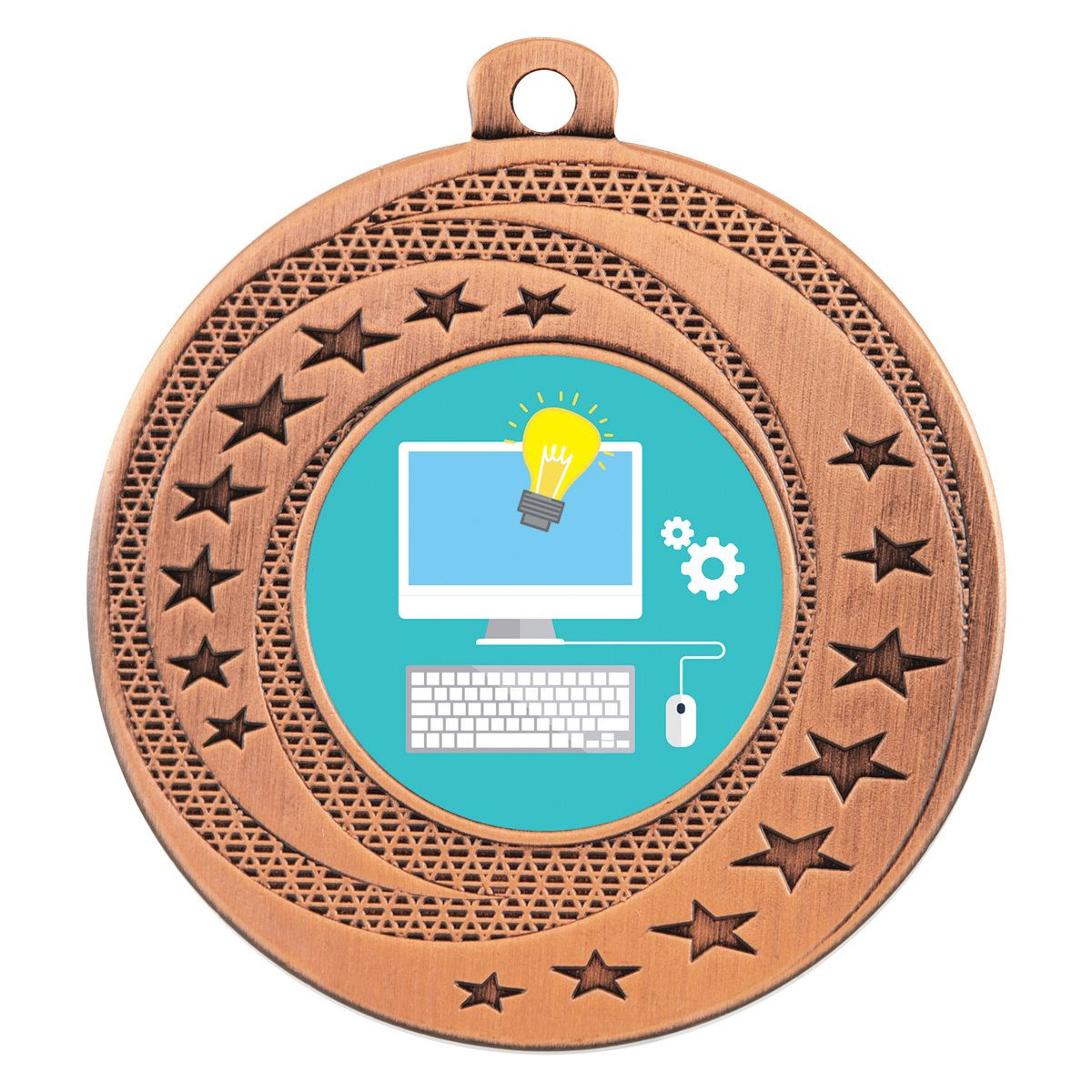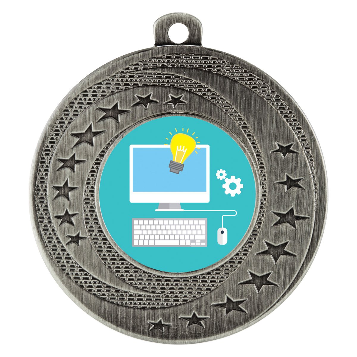 A circular medal frame with layered textures and star detailing surrounds a central insert space designed for information technology themed graphics for academic medals. The patterned ring and raised stars direct attention toward the insert area while the outer band keeps the medal structure balanced.