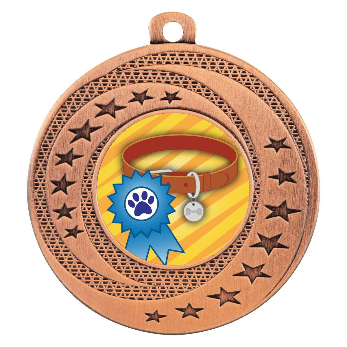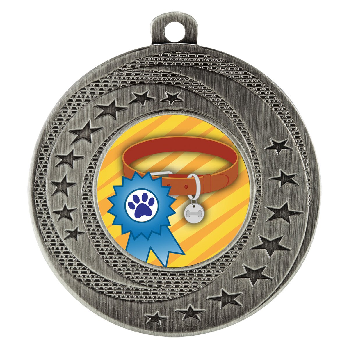 A round medal features a textured star border surrounding a 25 mm insert holder at the centre. The defined edge and layered detailing create a clear presentation for pet medals.