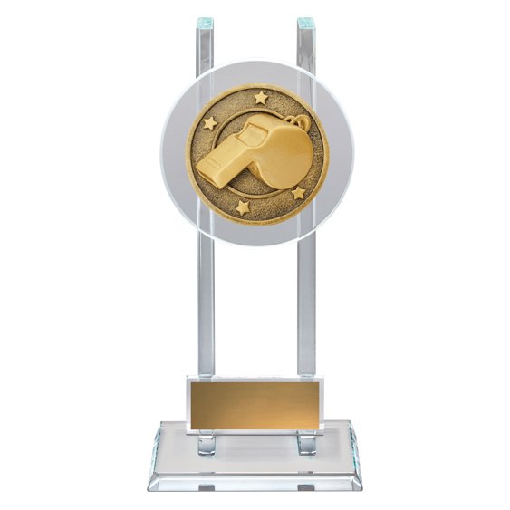 Whistle Spartan glass constructed with twin vertical glass pillars supporting a circular medallion featuring a raised whistle icon, mounted on a clear stepped glass base with front plate. The transparent structure and weighted proportions reflect the premium presentation style used across referee and coach trophies.