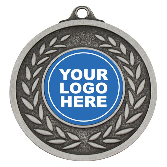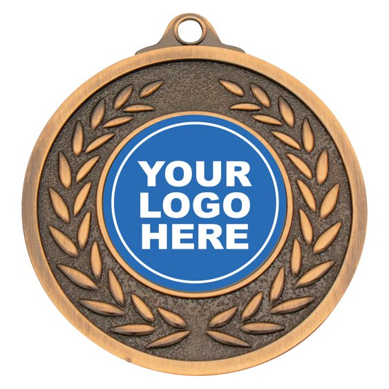 Laurel branches curve inward toward the central insert frame, forming a contained circular composition for custom medals. The recessed background and raised wreath detailing create layered depth while keeping the insert space clearly defined.